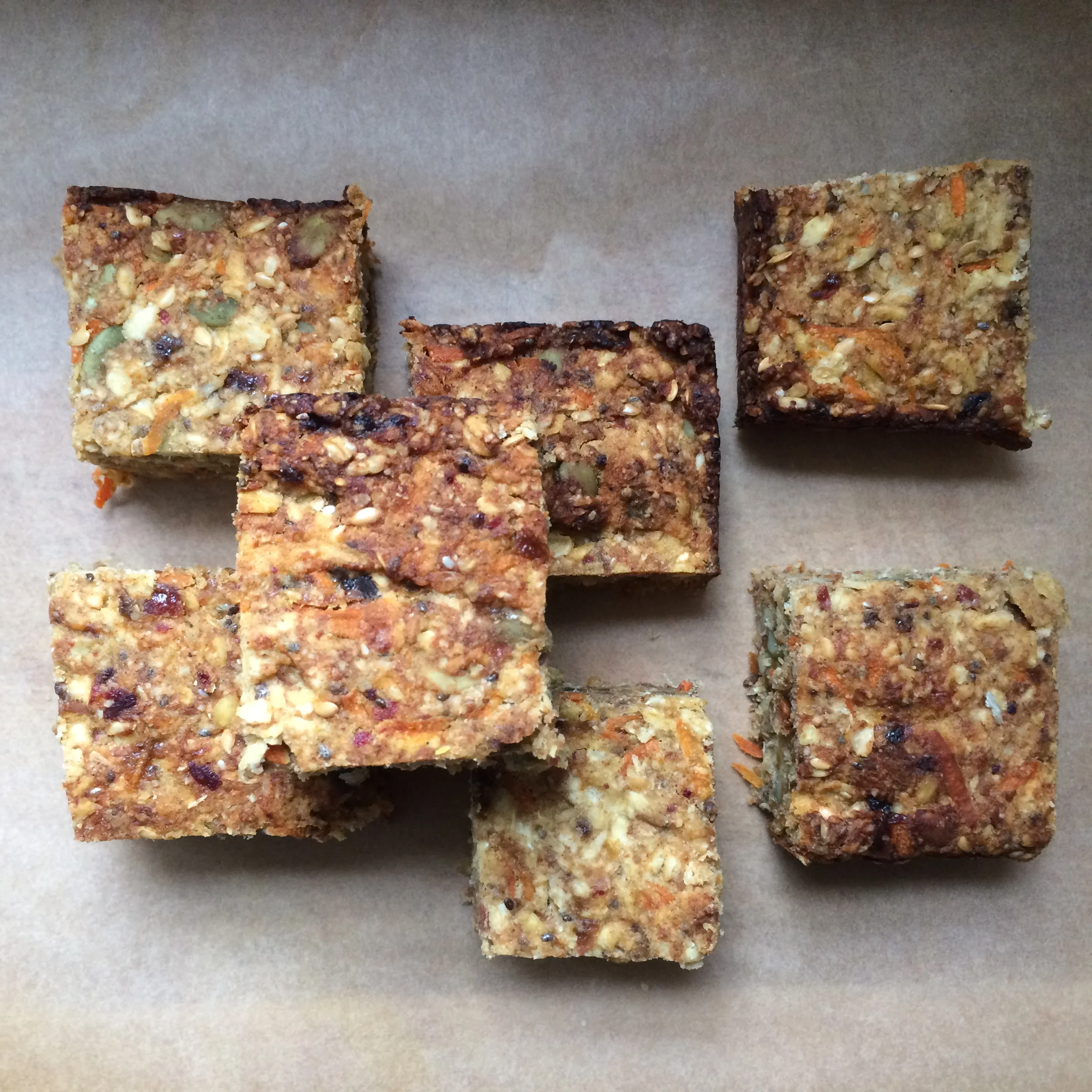 These handy little flapjack squares are perfect snacks for little and big people, or can be used as a breakfast bar if you are on the run. Using buckwheat or quinoa flakes plus pumpkin, flax and chia seeds make them protein dense, whilst also providing omega 3 fats from the chia and flax. We’ve even managed to sneak in a vegetable in the form of beta-carotene packed carrots, which are essential for your immune system.